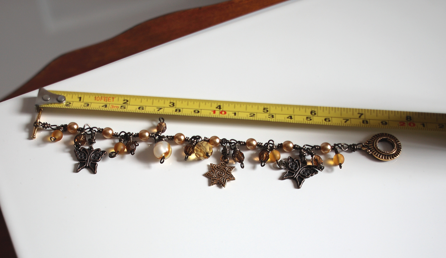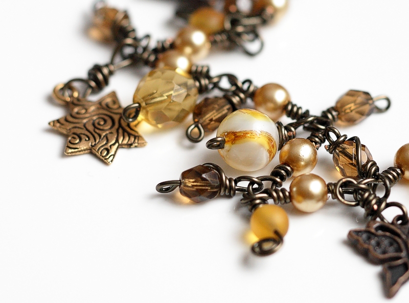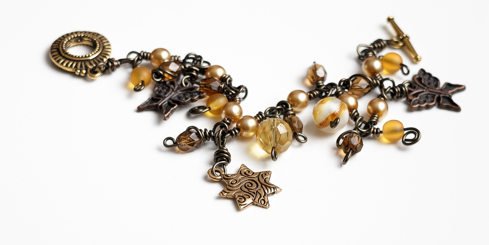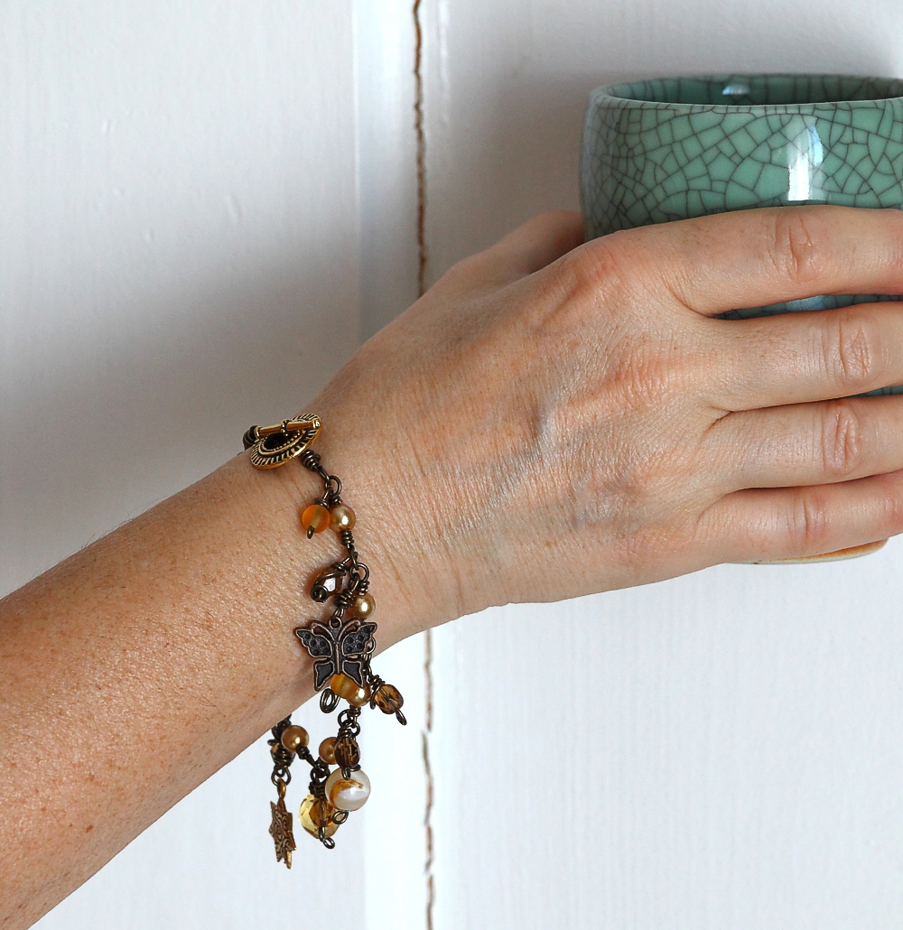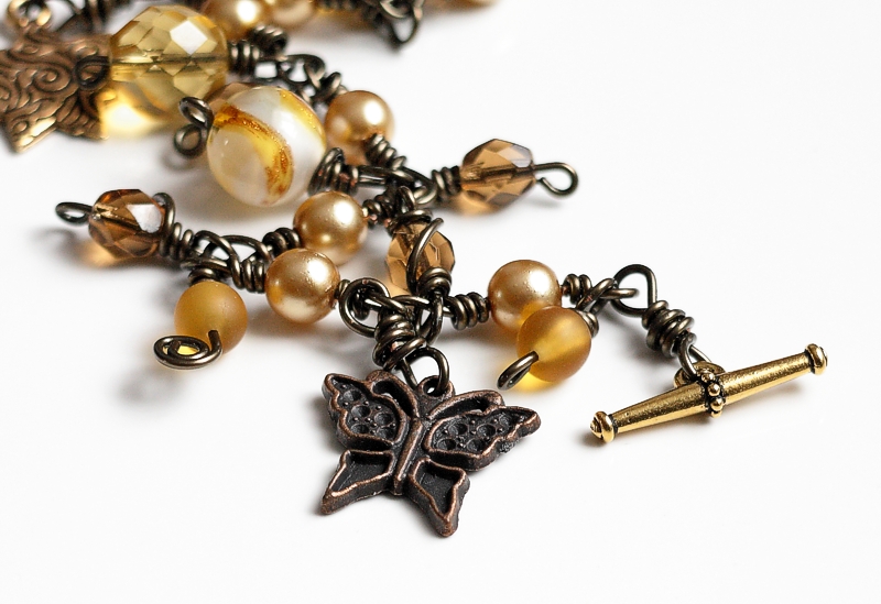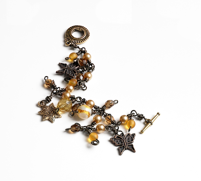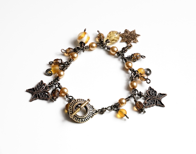 There is a lot of bohemian whimsy in this bracelet. It has warm, earthy metal and bead colors, as well as charm and bead dangles. Included are Czech faux pearls in light gold, a lampwork bead with gold dust, antique copper-plated pewter butterflies, a gold-plated pewter ornamental star charm, and Czech beads in topaz and honey yellow. I've hand-wrapped each one with wire that looks like aged brass and added a gorgeous gold-plated pewter sunburst toggle clasp.
