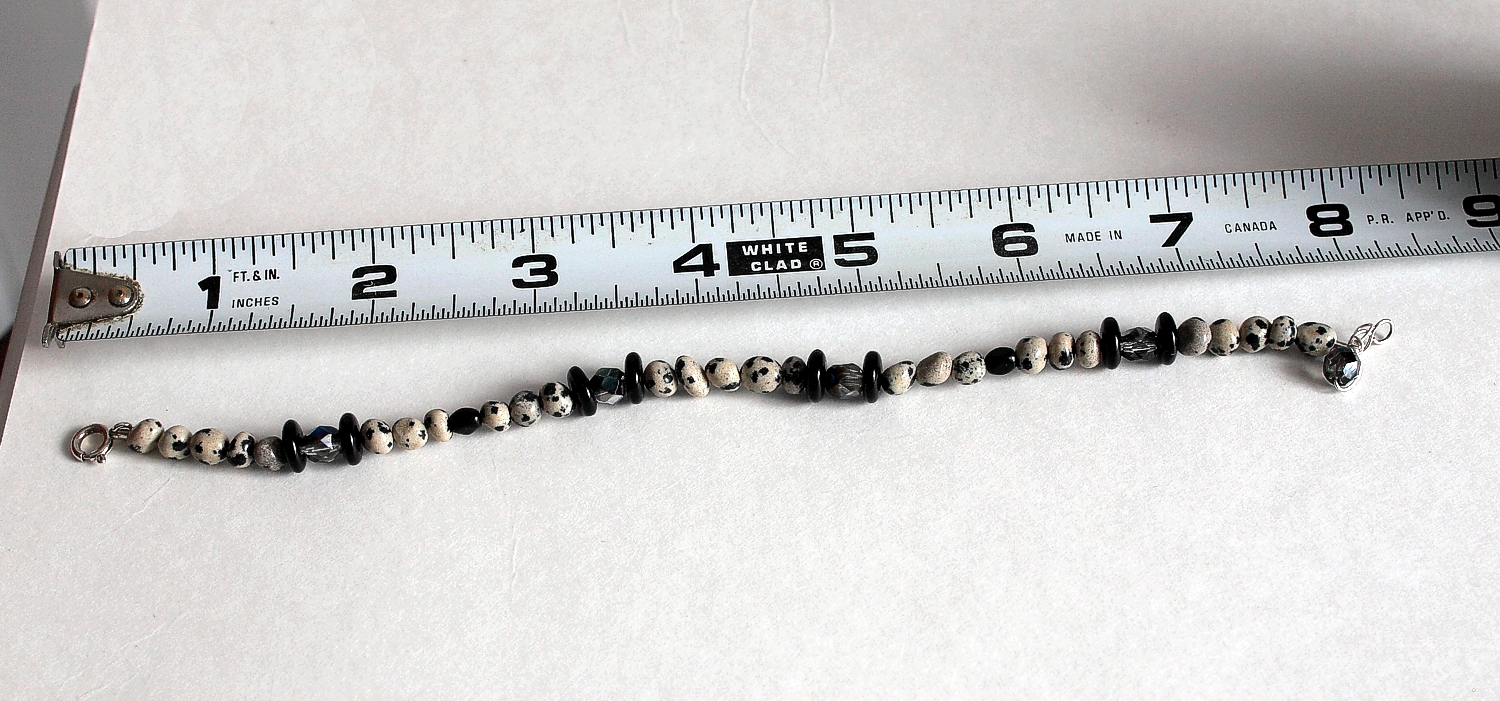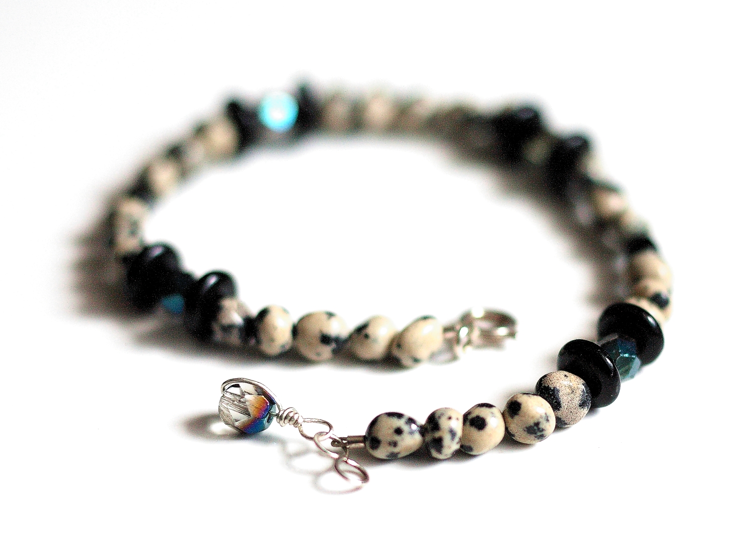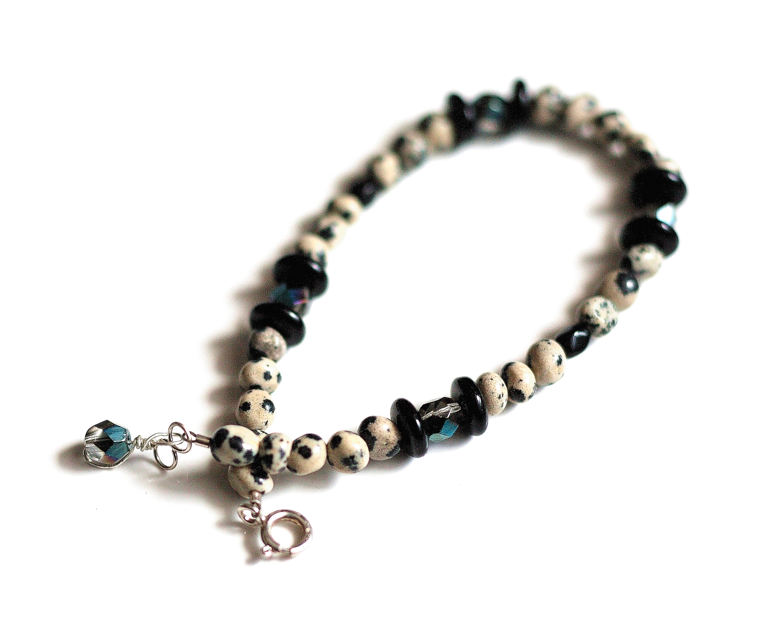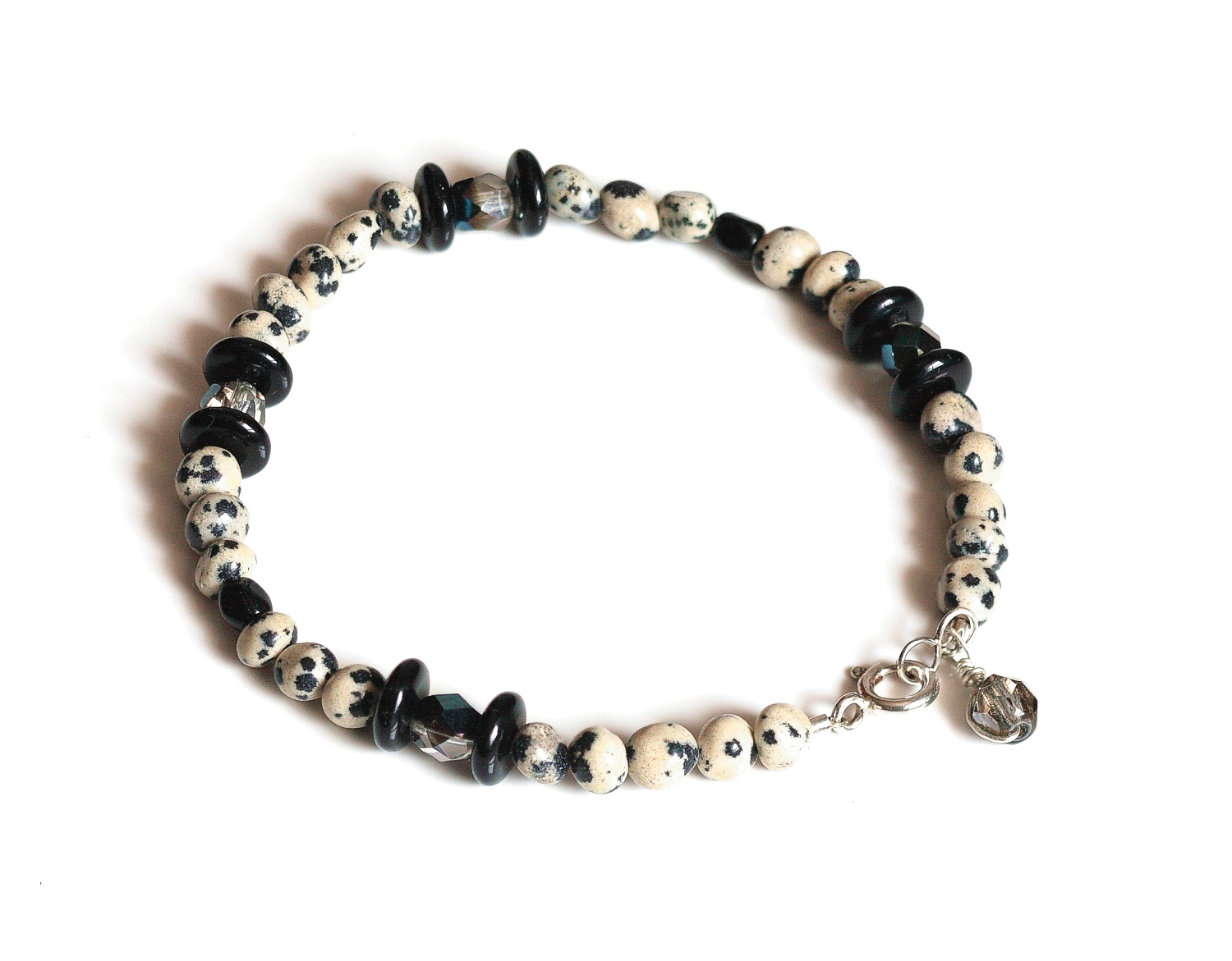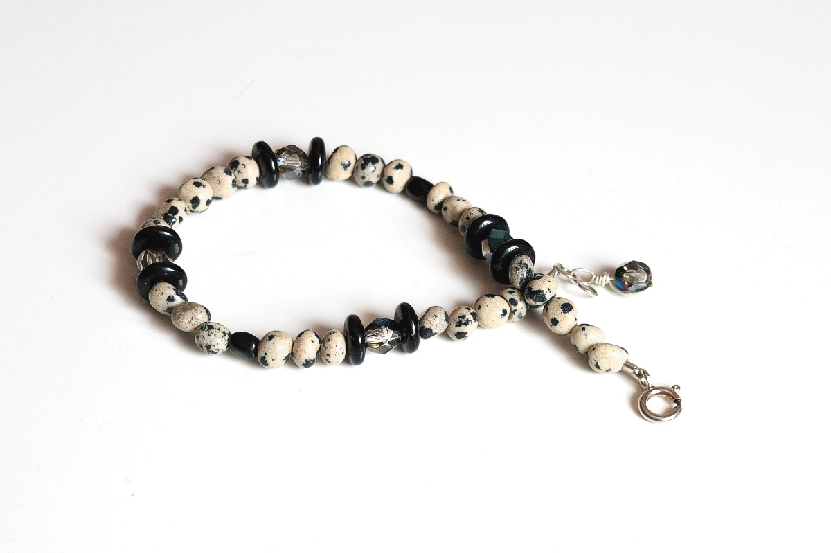 This bracelet features a boho laid-back design enhanced by a hint of sparkle. It is made with small dalmatian jasper (or dalmation stone) pebble beads that provide an organic look. The pebble beads showcase a creamy off-white base decorated with black spots, evoking the appearance of a dalmatian dog. I've also incorporated black Czech glass beads along with fire-polished black and brown beads. The difference between the stone and glass beads produces a interesting appearance. I have completed the look with a sterling silver spring ring clasp and a wire-wrapped dangle crafted from a fire-polished black and brown bead.