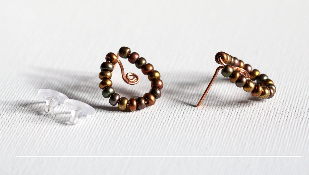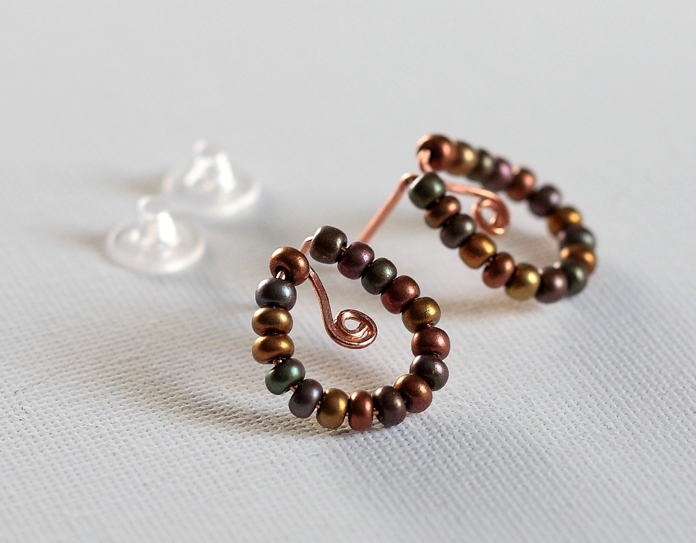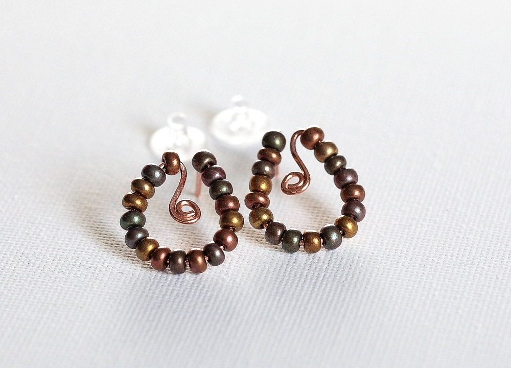 If you love an earthy, bohemian feel, these stud earrings are just what you need. They’re hand-forged from copper wire in a teardrop post/stud design, and I’ve added some Czech seed beads that catch the light beautifully. The beads create a delicate sparkle, featuring a gorgeous mix of earthy, muted autumn shades of gold, copper, red, and green. A little swirl accent has been added to enhance the design. These are the perfect pair of earrings to wear when you want to glam up your turtleneck sweater and pony tail.