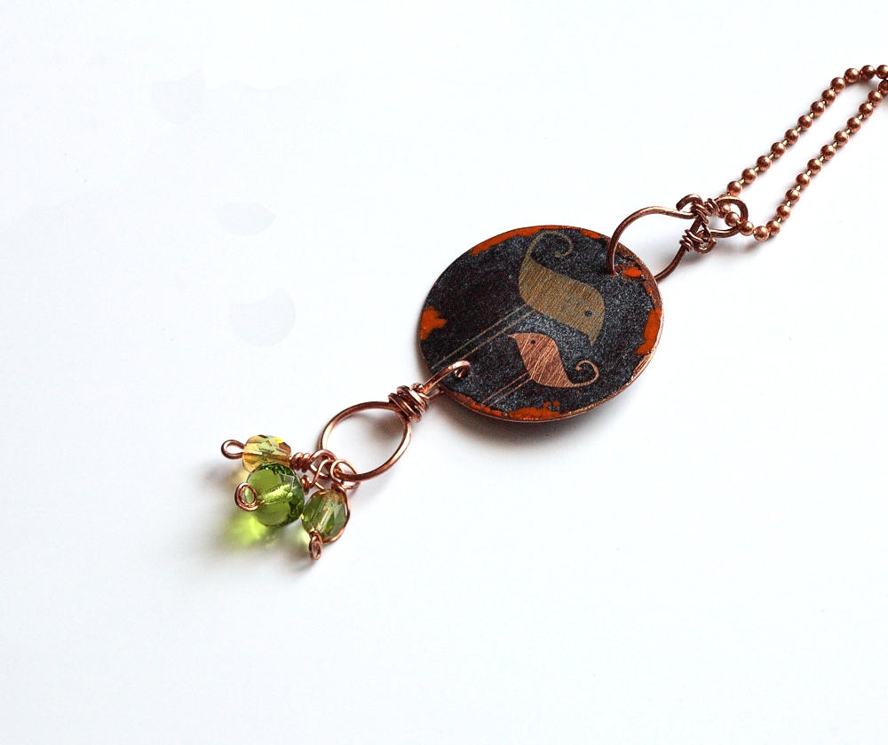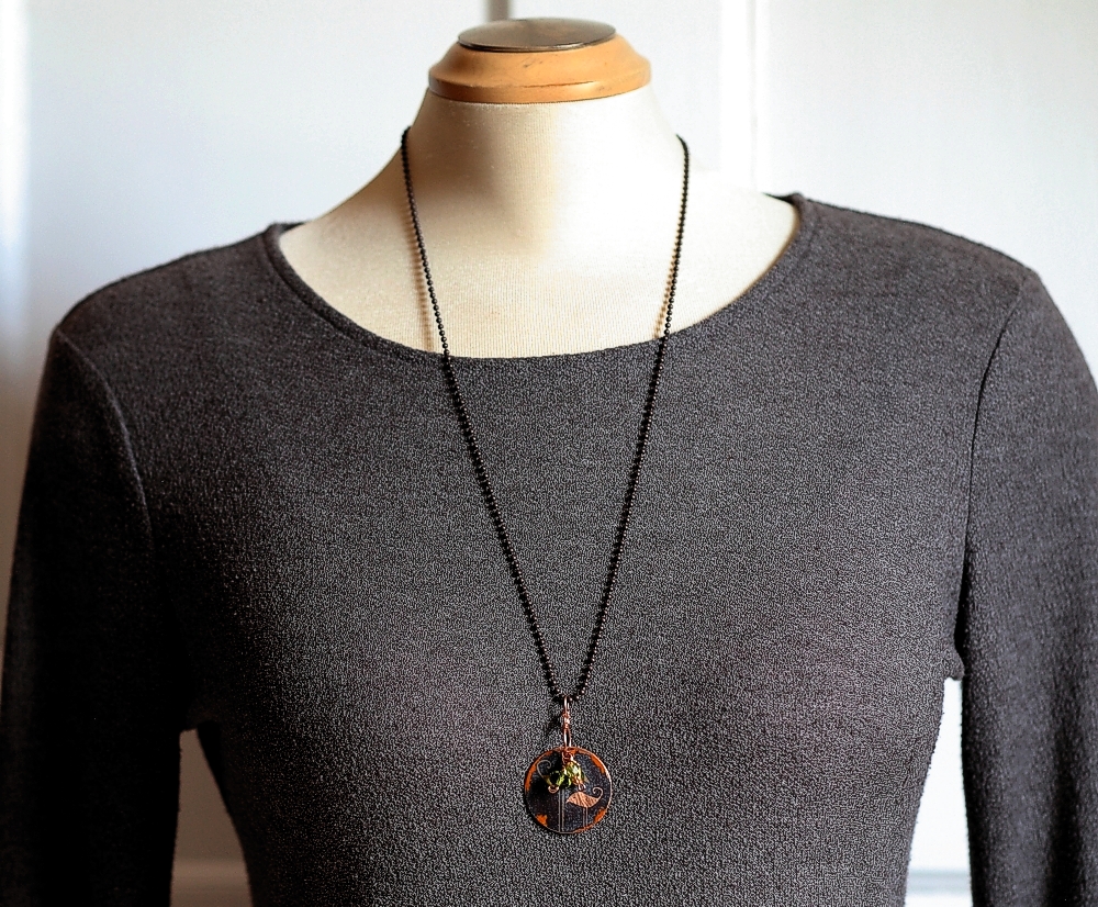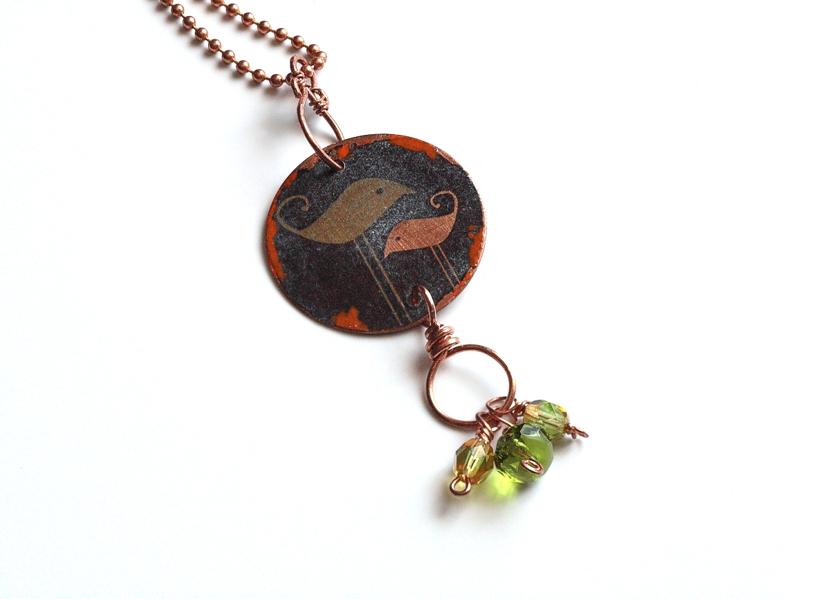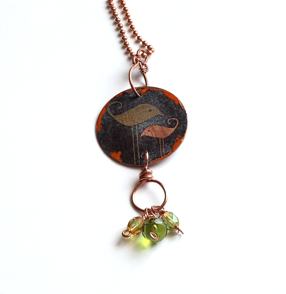 This is a charming and playful necklace for a nature enthusiast. A mother bird and her young are depicted on a copper disc in a charming modern art deco design with a modern twist. I embellished to give a worn out, faded look and sealed with varnish. The pendant swings from a copper ball chain and is suspended from a handcrafted copper bail adorned with wire-wrapped topaz and peridot green glass beads. It's a long simple casual boho style necklace to wear over a long sweater or tunic and easily slips over your head.