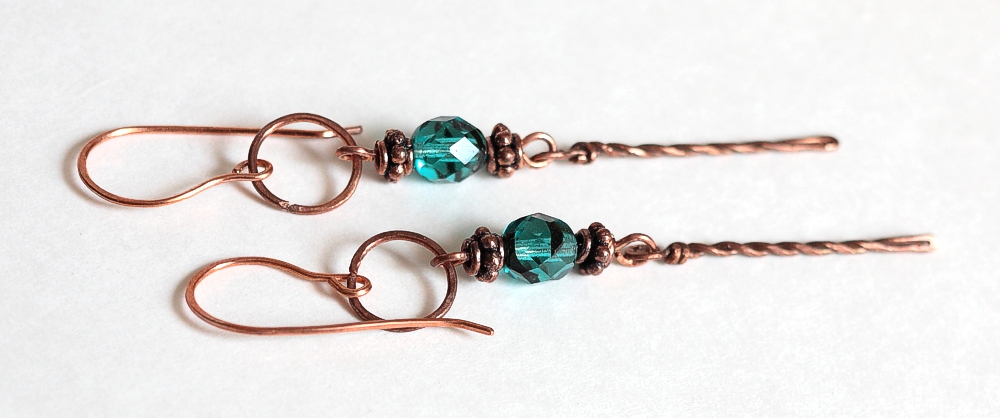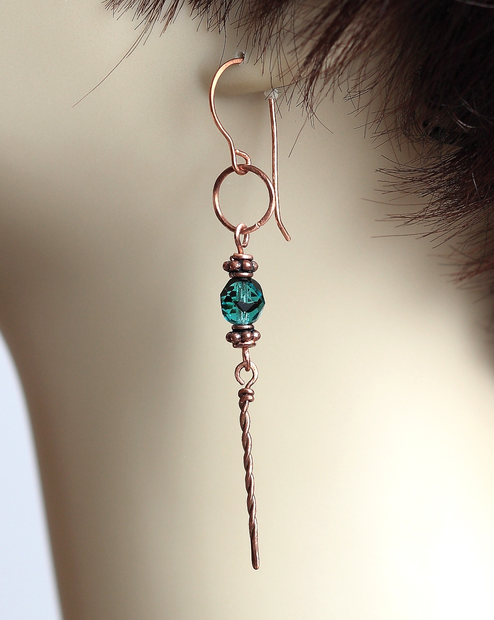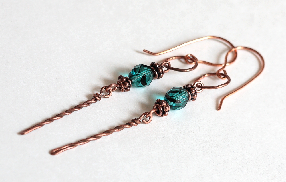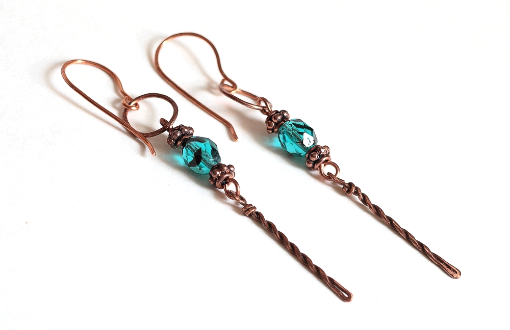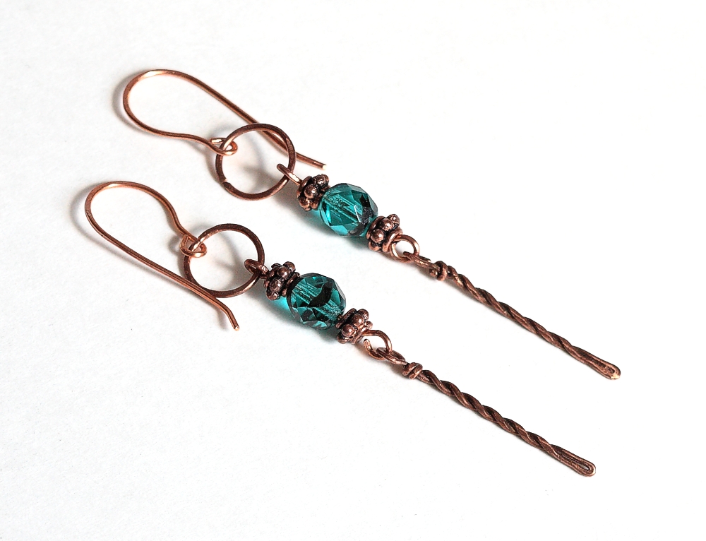 These handmade long copper dangle earrings, showcase twisted wire sticks and decorative copper beads in combination with beautiful teal and black Czech glass beads. All are suspended from elegant ear wires. These natural copper earrings embody a laid-back bohemian style.