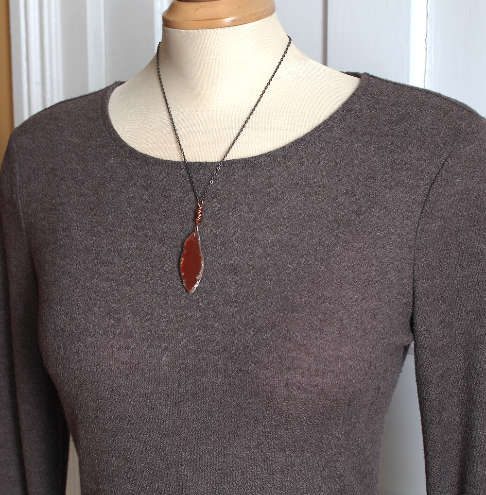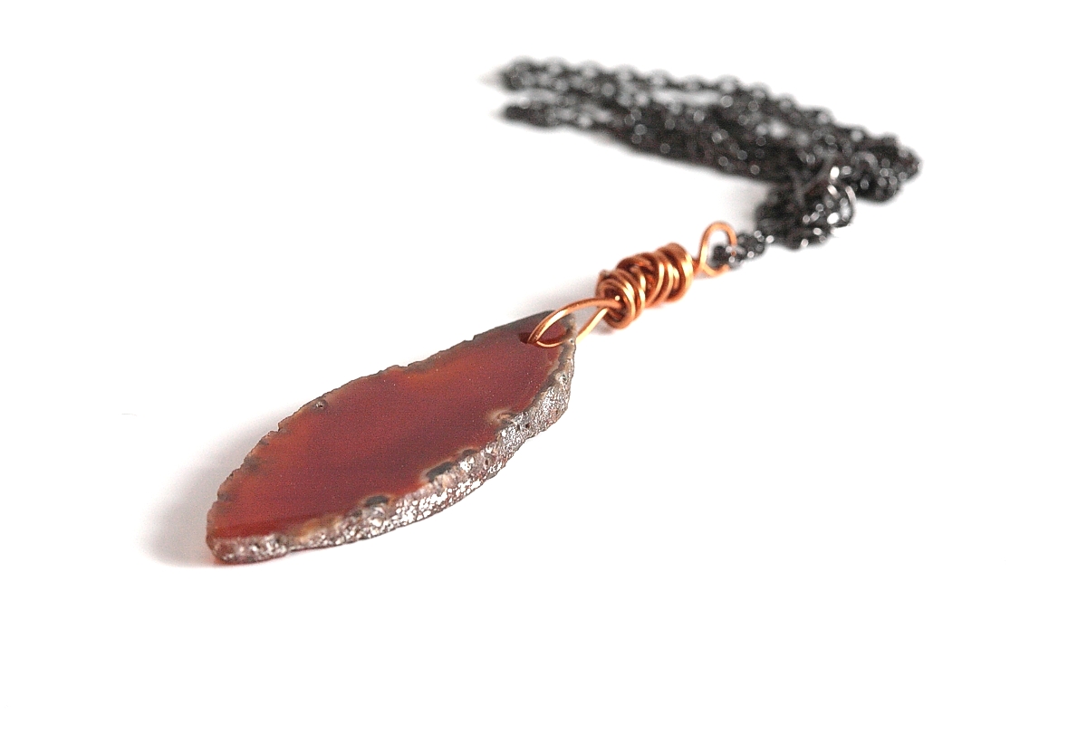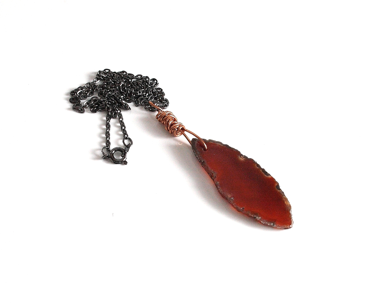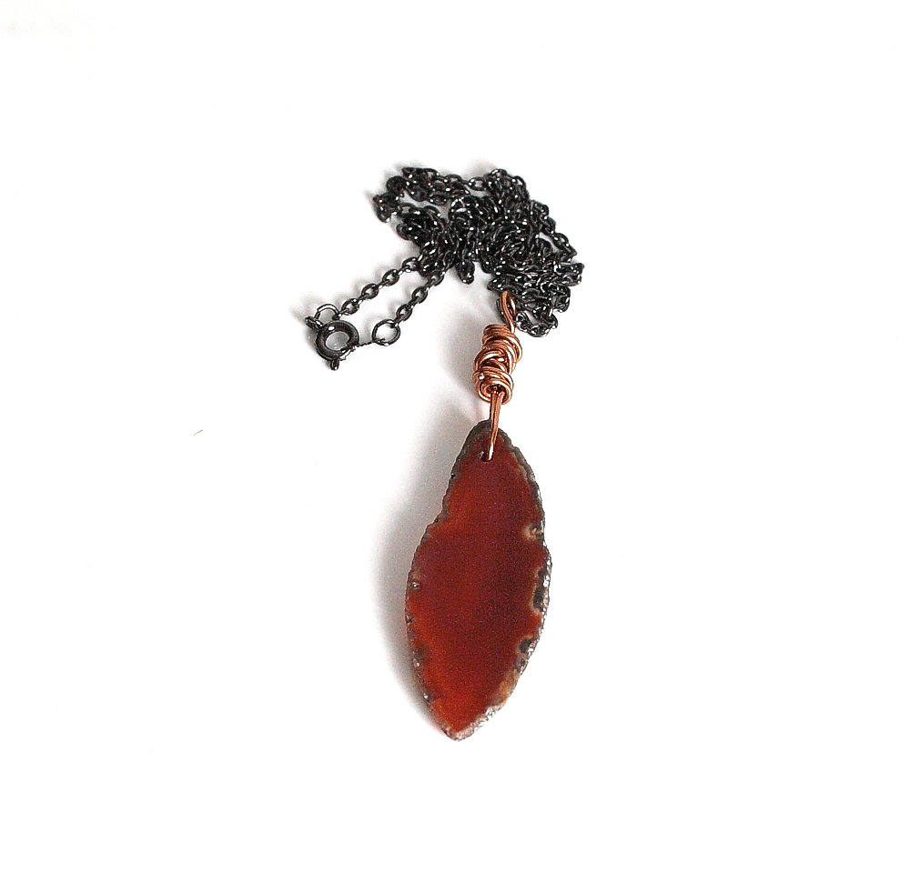 This necklace features an agate slice in a burnt orange or reddish brown like autumn leaves. This lovely stone slice is wire wrapped using tarnish resistant coated copper wire and is suspended from a fine dark gray cable chain, secured with a spring ring clasp. The simple design is elevated by the combination of copper and gray chain.
