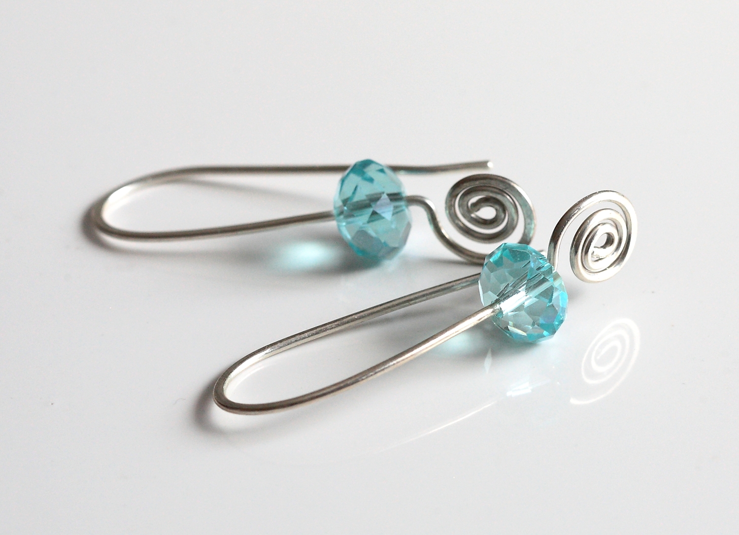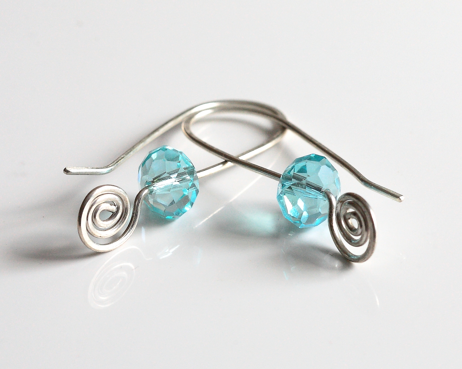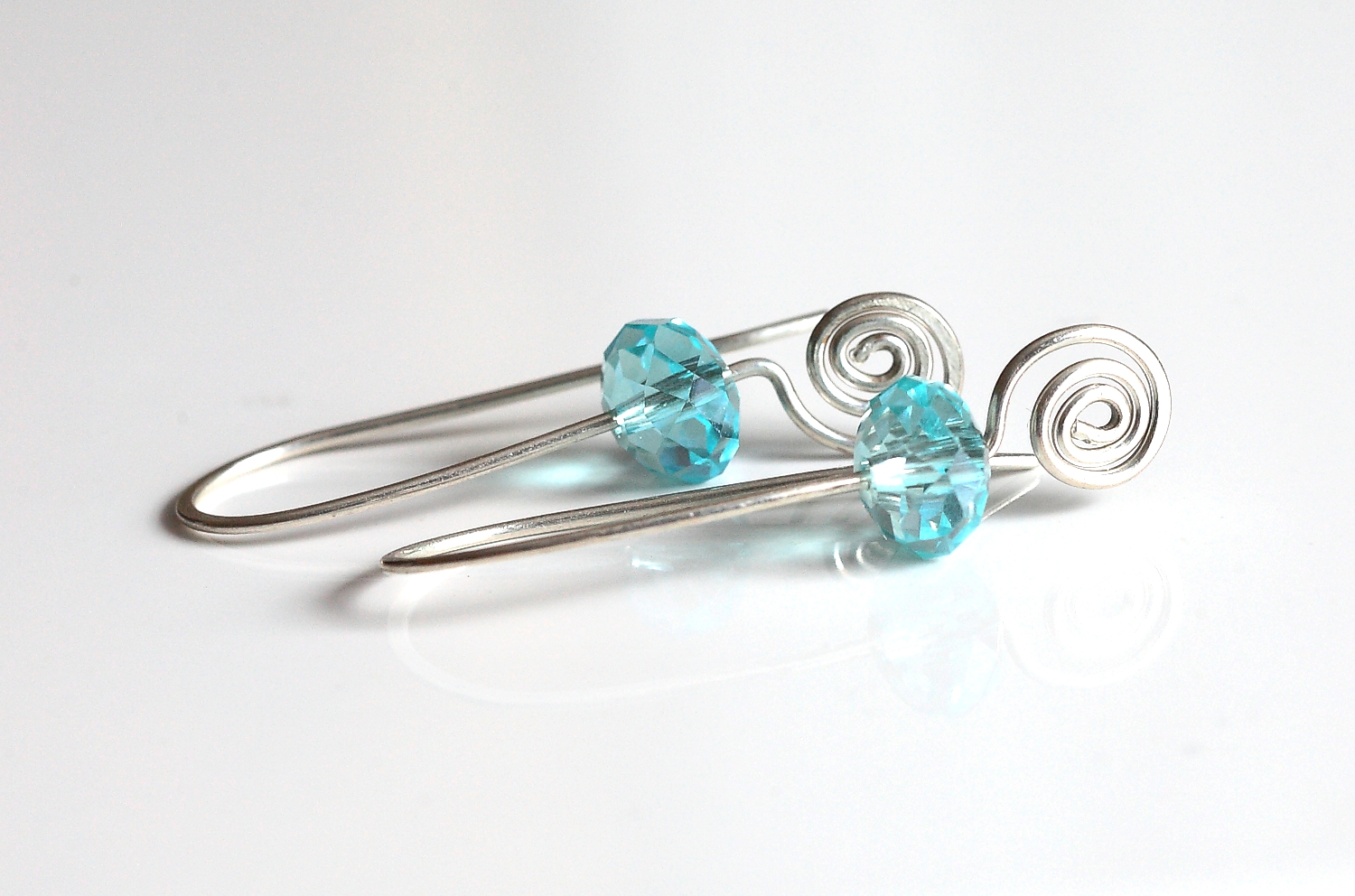 These are whimsical handmade long silver wire threader earrings with a swirl design that is accented by vibrant blue turquoise crystals for an eye-catching flair. These statement earrings easily thread through the earlobe and are crafted with Argentium Sterling Silver wire which is highly tarnish resistant and more pure than traditional sterling silver (935 vs 925) and made using recycled silver.
