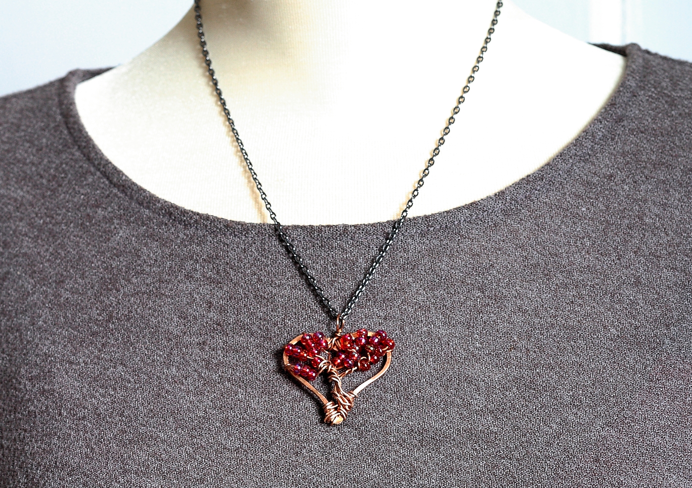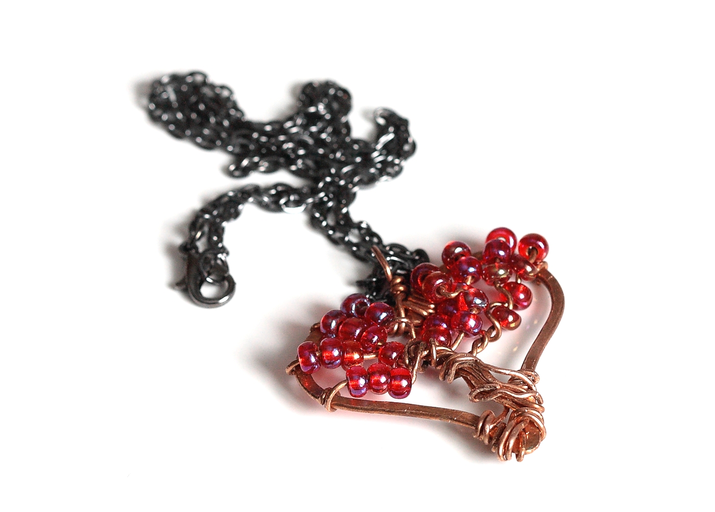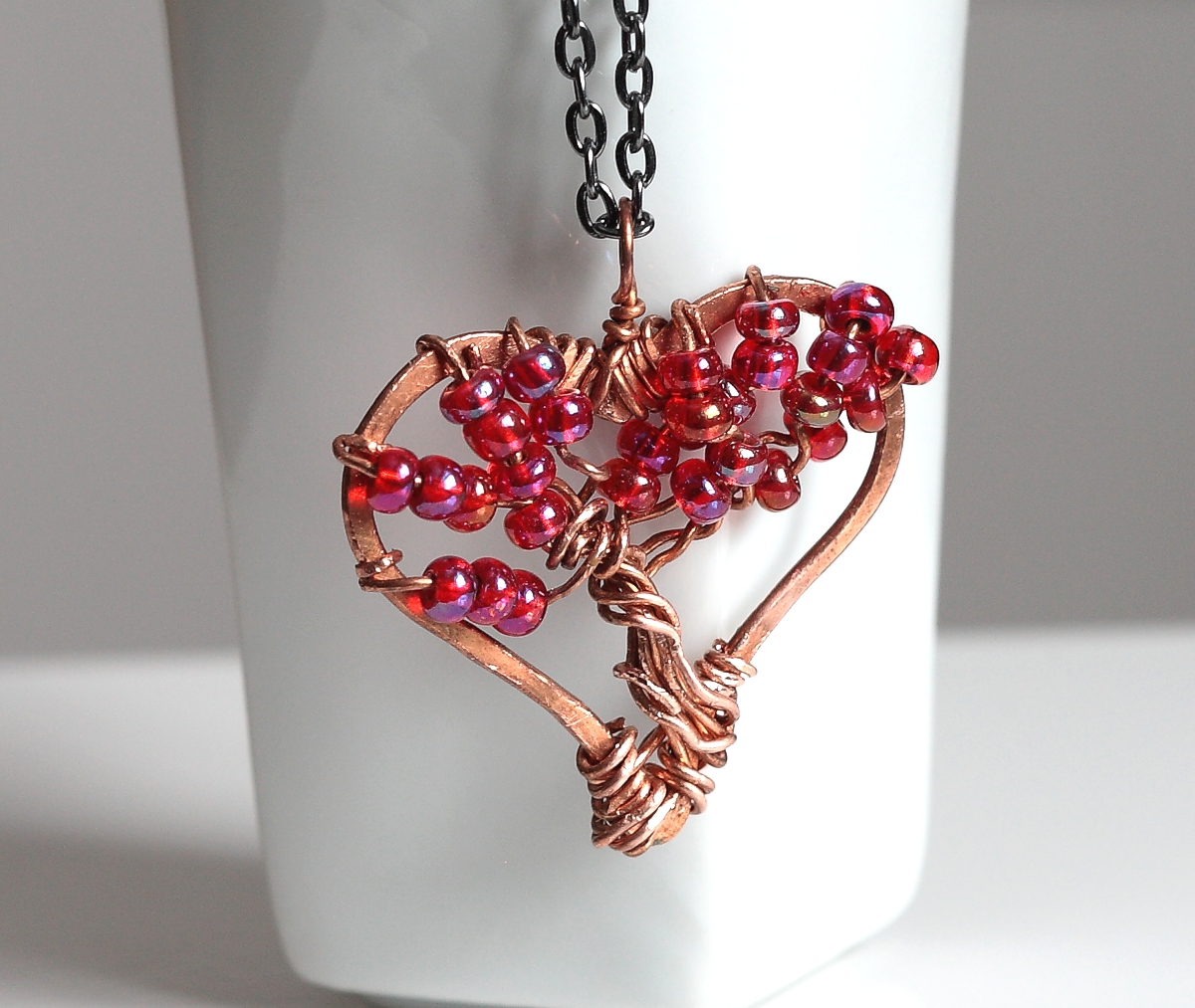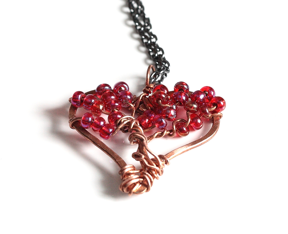 Made from copper wire, this is a bohemian casual tree of life within a heart shaped frame. I have hand formed both the frame and tree, decorating the tree with Czech ruby red seed beads. The pendant is suspended from a delicate dark grey cable chain with a spring ring clasp. It's a lovely necklace to gift someone or to treat yourself.